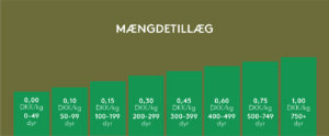 Mængdetillægget er inddelt i 8 afregningssatser. Det betyder, at der ved f.eks. 500 dyr udbetales 0,75 DKK pr. kg for samtlige antal slagtekilo leveret etc.